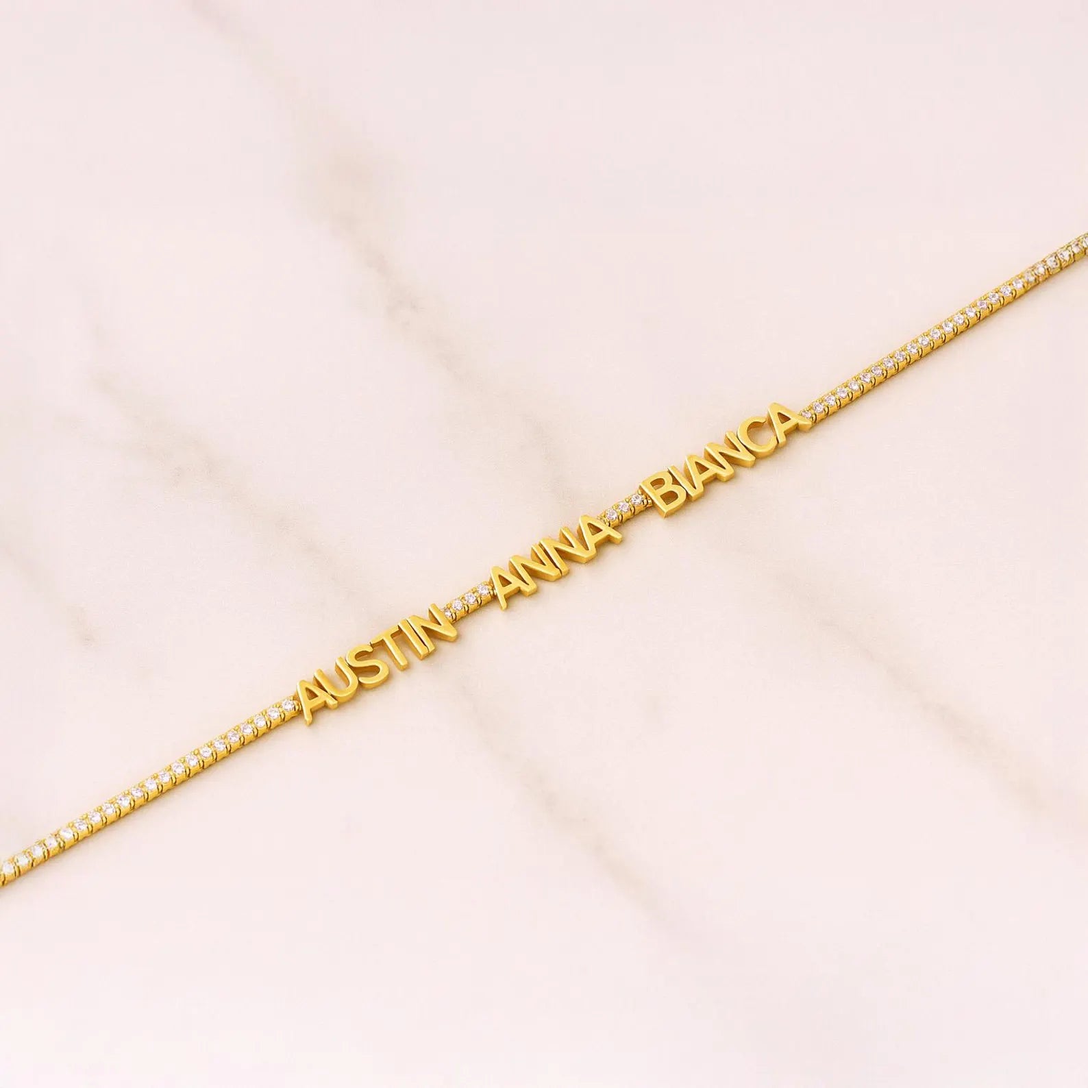 Elevate your elegance with our Multiple Name Tennis Chain Bracelet, a dazzling fusion of personalization and luxury. This exquisite custom name bracelet features a sleek tennis-style chain adorned with brilliant moissanite diamonds, offering unmatched sparkle and sophistication. Each bracelet is customized with multiple names, making it the perfect way to honor your loved ones